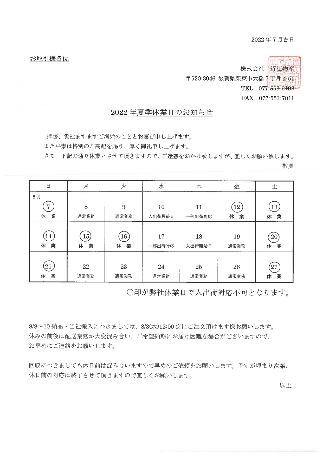 弊社は2022年8月12日(金)~8月16日(火)お盆休暇とさせて頂きます。